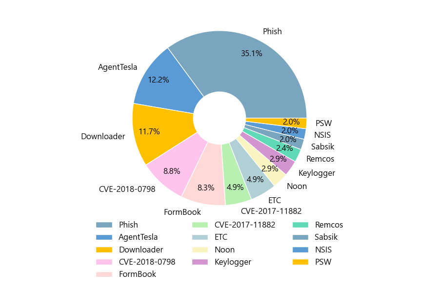첨부파일은 ‘Phish’형태가 35.1%로 제일 큰 비중을 차지했고 뒤이어 ‘AgentTesla’, ‘Downloader’가 각각 12.2%, 11.7%의 비중을 차지했습니다.
