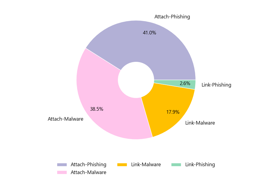 악성 이메일을 유형별로 살펴보면 39건 중 Attach-Phishing형이 41.0%로 가장 많았고 뒤이어 Attach-Malware형이 38.5%를 나타냈습니다.
