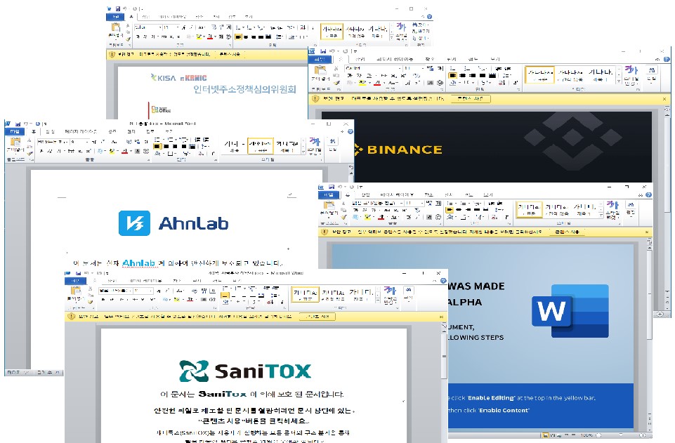 해당 악성코드는 주로 MS 워드 문서로 위장하고 있으며 사용자가 내용을 확인하기 위하여 "콘텐츠 사용" 을 선택하면 VBA 매크로가 실행되어 서버에서 암호화된 페이로드를 다운로드 받아서 악성코드를 실행합니다.