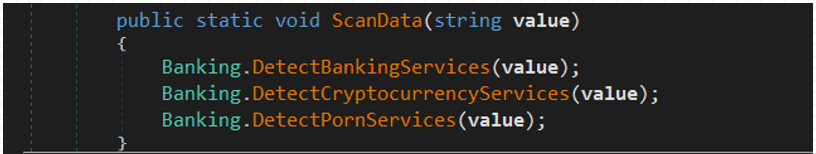 이 단계에서 악성코드는 ScanData()를 통해 브라우저 데이터에 은행, 암호화폐, 포르노 사이트와 관련된 키워드가 있는지 확인하고 있을 경우 이를 훔칩니다.