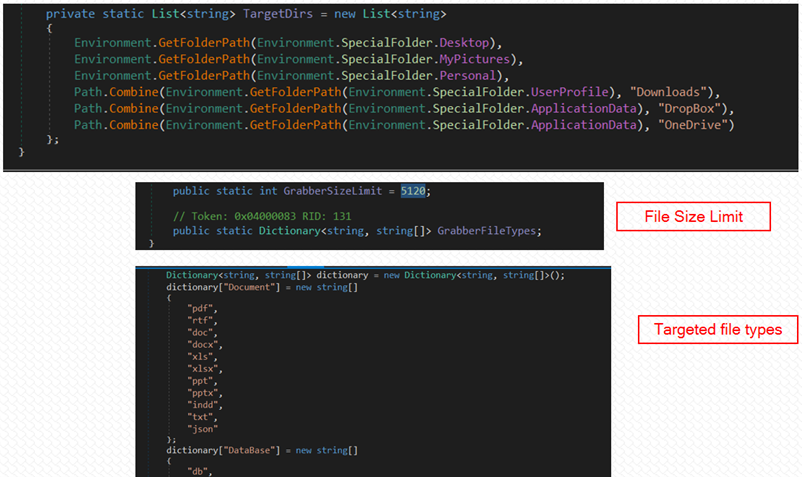Prynt Stealer는 처음에 호스트의 모든 드라이브를 검색한 후 크기가 5,120바이트(5KB) 미만인 문서, 데이터베이스 파일, 소스 코드 파일, 이미지 파일을 탈취합니다.