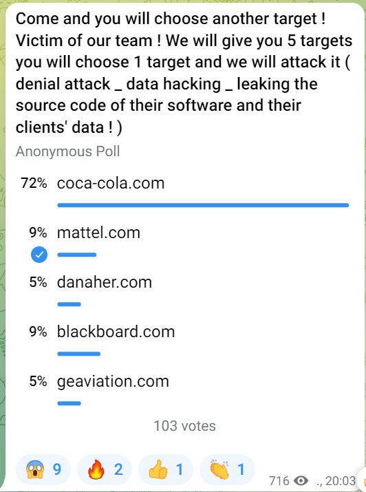 이 해킹 그룹은 최근 텔레그램 채널 회원들에게 다음 타깃 회사를 선택하도록 요청하는 설문 조사를 진행했으며, 그 결과 코카콜라가 가장 많은 표를 받았습니다.