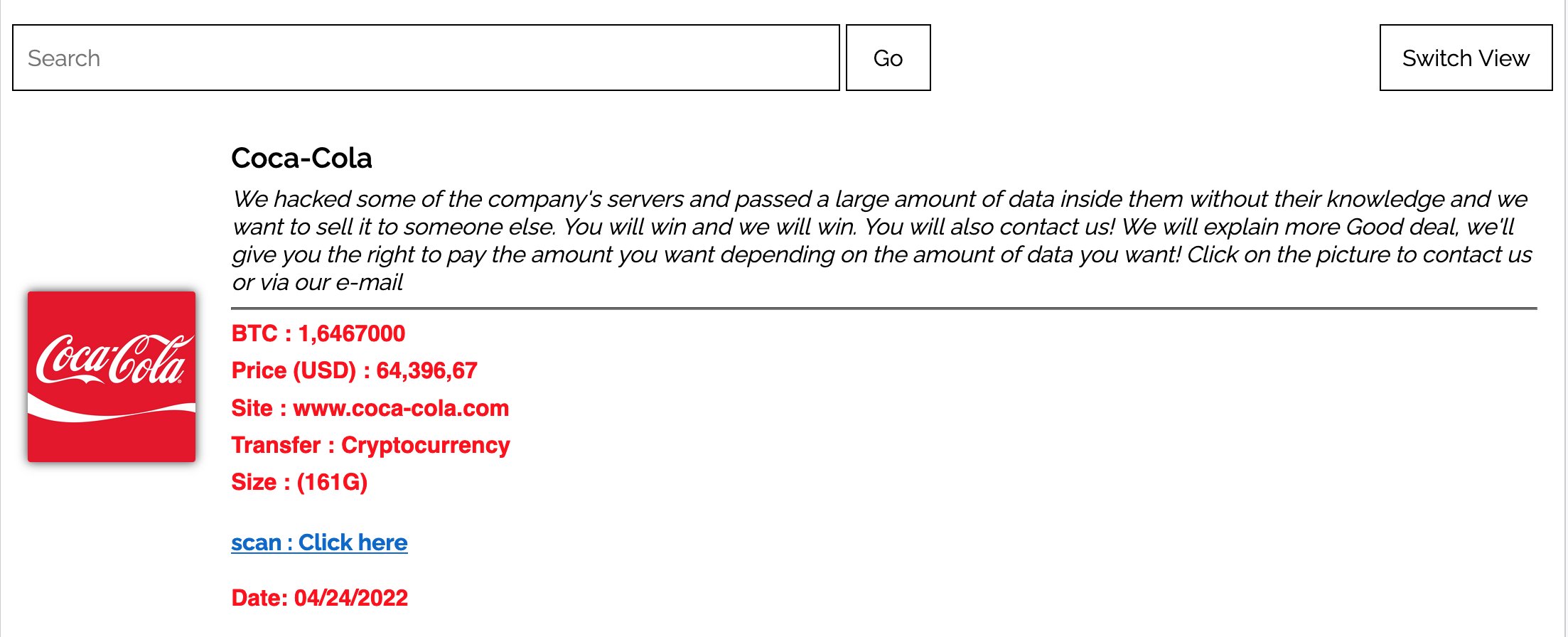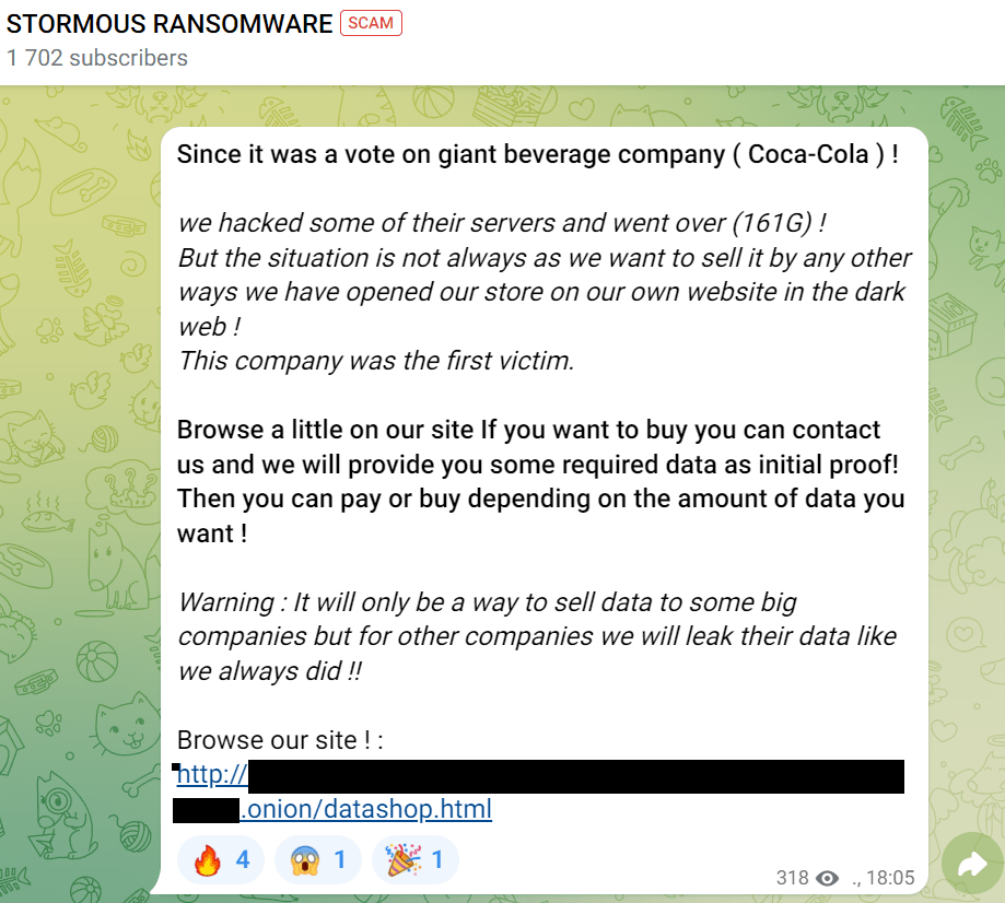 Stormous 랜섬웨어 그룹이 그들의 유출 사이트에 글로벌 음료 회사인 Coca-Cola Company를 해킹했다고 발표했습니다.