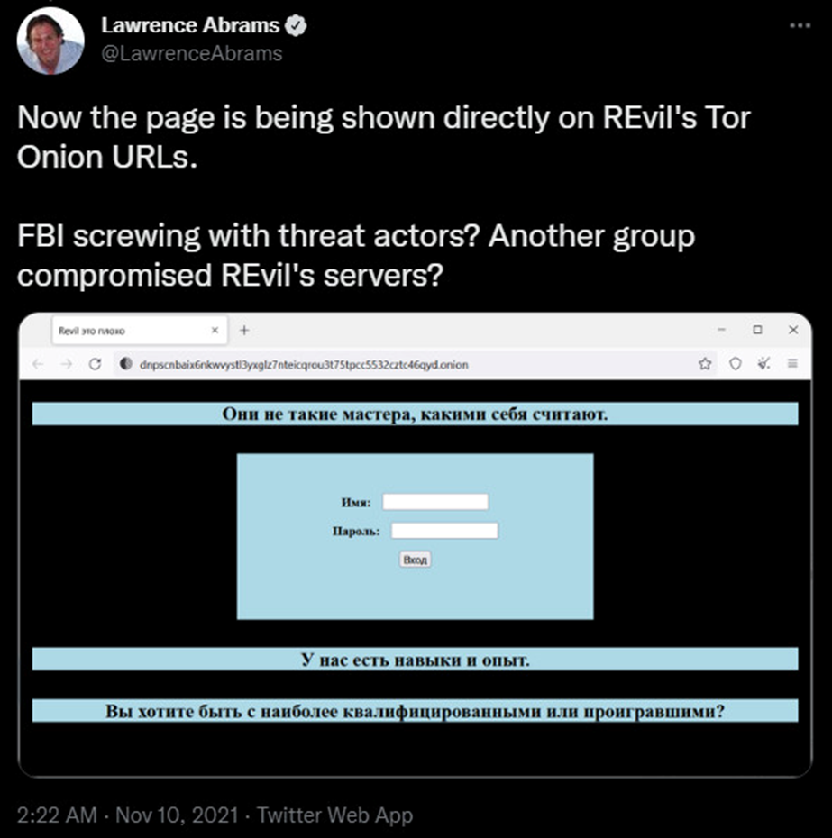 지난 10월 법 집행 기관이 REvil 랜섬웨어의 Tor 서버를 압수한 후 러시아의 법 집행 기관이 그룹의 멤버를 체포하여 활동을 중단했습니다.
