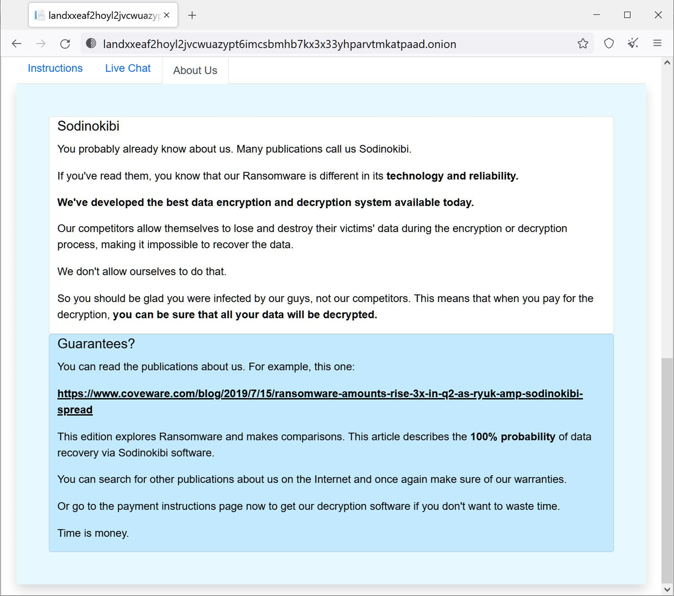 또한 기존 REvil 사이트와 리브랜딩된 사이트에는 약간의 차이가 있지만, 피해자가 사이트에 로그인할 경우에는 이전 사이트와 거의 동일한 것으로 나타났습니다. 또한 공격자는 아래와 같이 'Sodinokibi'라 주장하고 있었습니다.