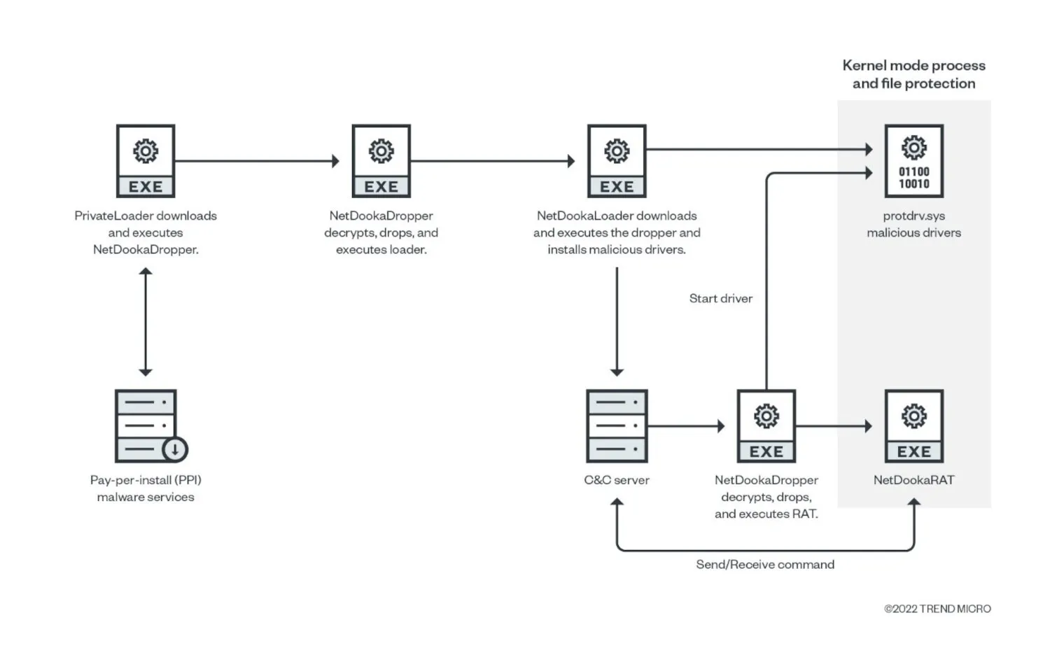 NetDooka 감염은 PrivateLoader가 드로퍼 컴포넌트를 배포하는 통로 역할을 하는 것으로 시작됩니다. 이후 로더를 복호화 후 실행한 다음 완전한 기능을 갖춘 트로이목마 및 커널 드라이버를 설치하기 위해 원격 서버에서 다른 드로퍼를 받아옵니다.