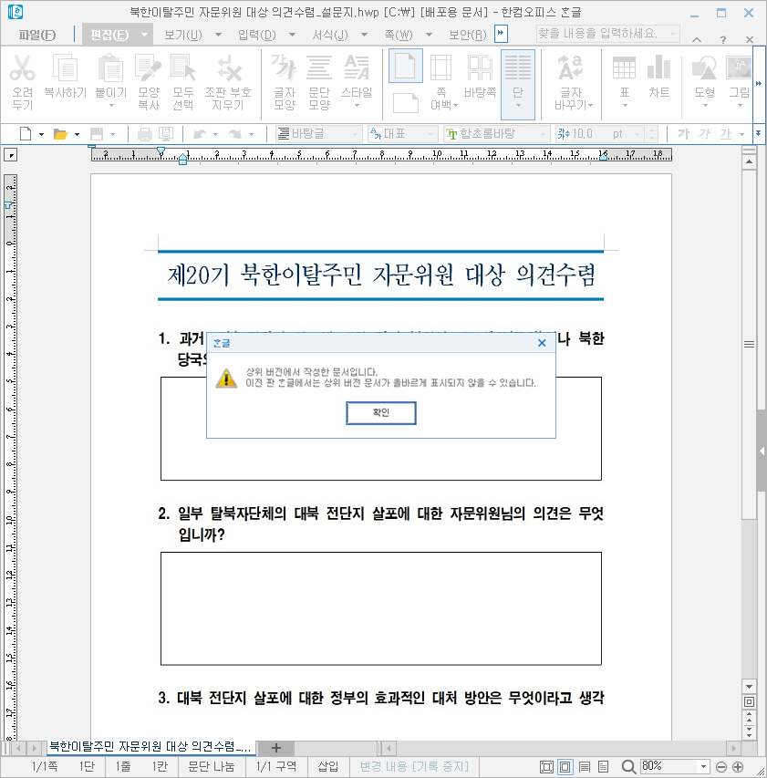 북한이탈주민(탈북민) 자문위원들에게 의견을 수렴하는 내용처럼 위장한 HWP 악성 문서 기반 北 연계 해킹 공격이 발견되어 사용자들의 각별한 주의가 필요합니다.