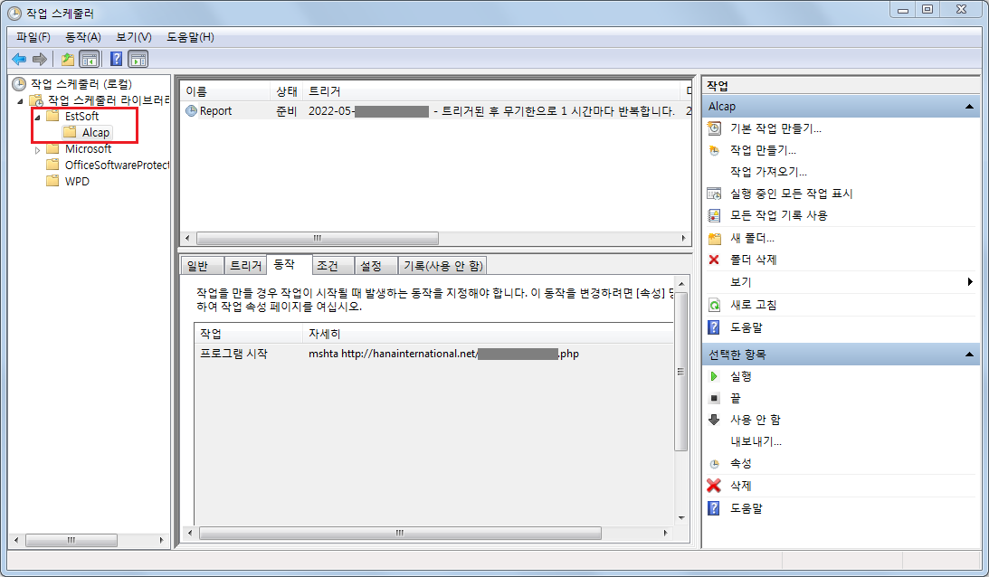 주목할 점은, 명령제어(C2) 서버로 통신을 시도할 때, 외부에 노출되는 것을 숨기기 위하여 작업 스케줄러에 잠복 기능처럼 동작 조건을 추가했으며, 마치 이스트소프트 프로그램처럼 위장하는 수법을 사용했다는 것입니다.