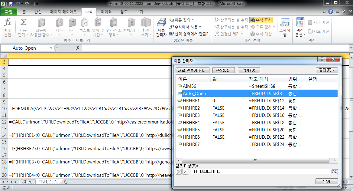 만일 사용자가 첨부되어 있는 excel 파일을 실행한다면 '콘텐츠 사용' 버튼의 활성화를 유도합니다. 만일 사용자가 콘텐츠 사용 버튼을 활성화 하면, 숨겨진 시트에 포함되어 있던 악성 명령어를 Auto_Open을 이용하여 실행합니다.