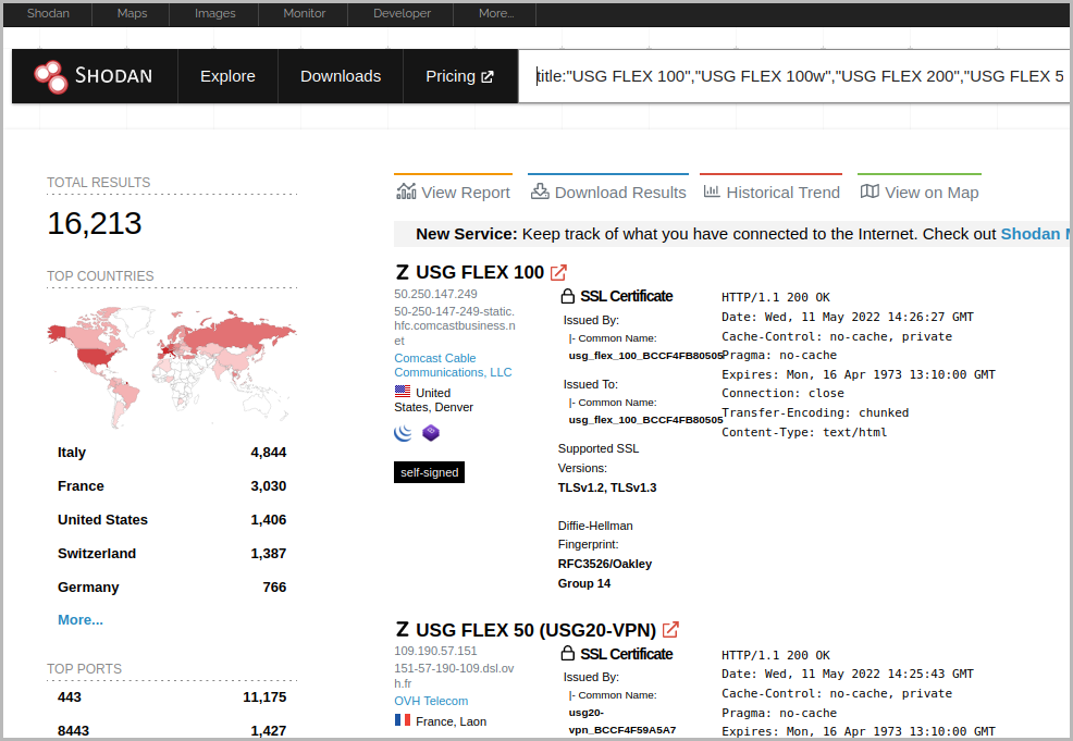<취약한 Zyxel 방화벽의 Shodan 검색 결과>