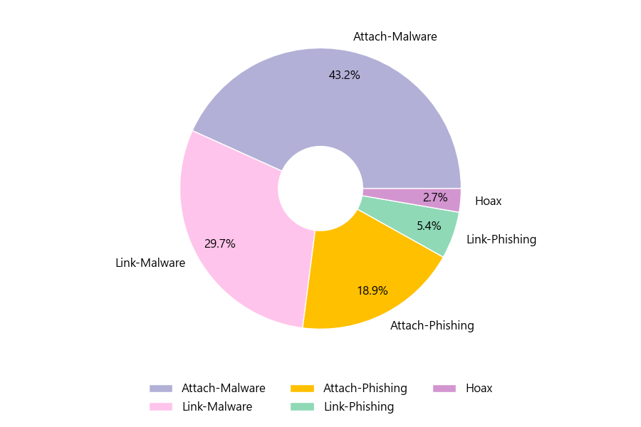 악성 이메일을 유형별로 살펴보면 37건 중 Attach-Malware형이 43.2%로 가장 많았고 뒤이어 Link-Malware형이 29.7%를 나타냈습니다.