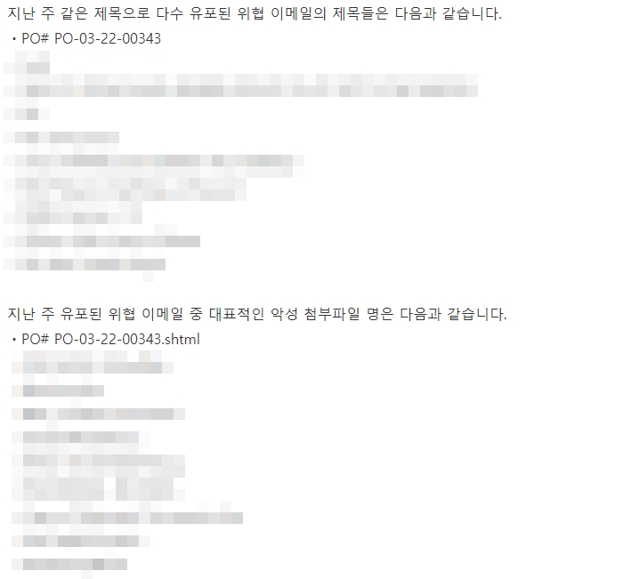 지난주 이메일 유입량은 총 82건이고 그중 악성은 37건으로 45.12%의 비율을 보였습니다. 악성 이메일의 경우 그 전주 16건 대비 37건으로 21건이 증가했습니다.