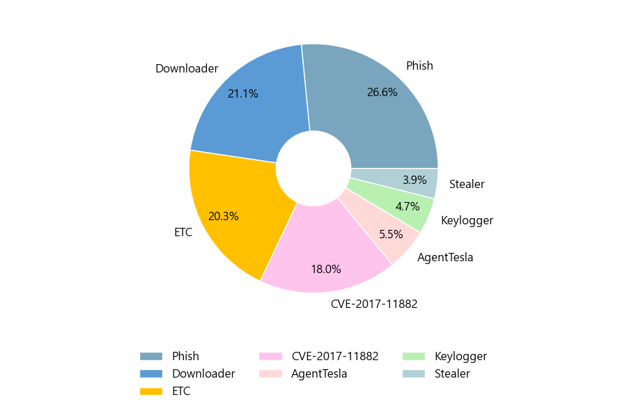 첨부파일은 ‘Phish’형태가 26.6%로 제일 큰 비중을 차지했고 뒤이어 ‘Downloader’, ‘ETC’가 각각 21.1%, 20.3%의 비중을 차지했습니다.