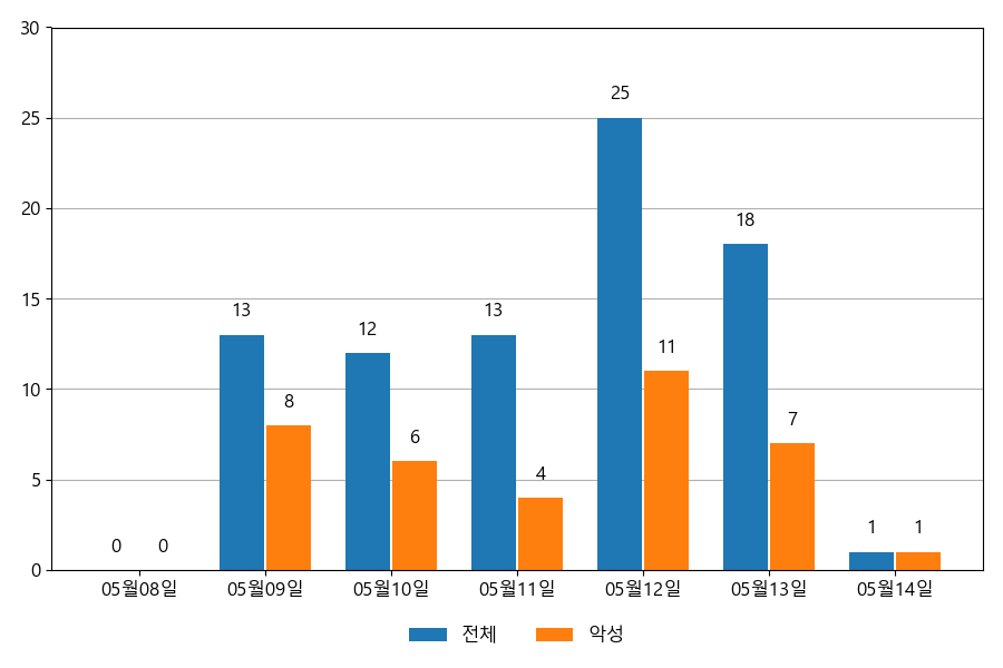 일일 유입량은 하루 최저 1건(악성 1건)에서 최대 25건(악성 11건)으로 일별 편차를 확인할 수 있습니다.
