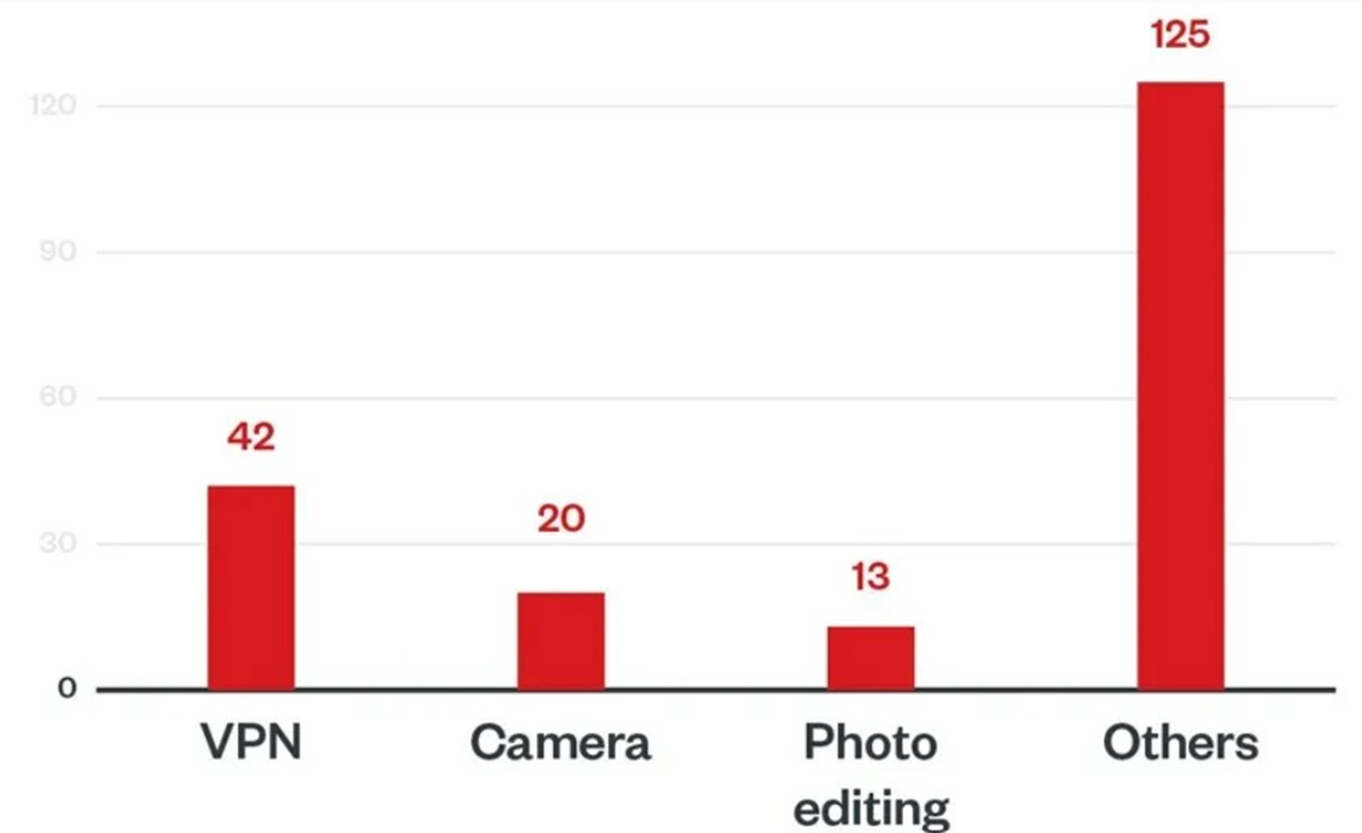 악성 앱의 대부분은 VPN 소프트웨어(42개), 카메라(20개), 사진 편집(13개) 앱이었습니다.