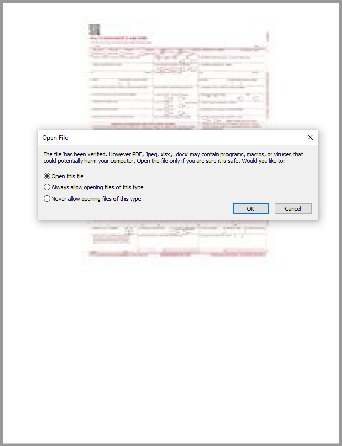 공격자가 내장된 문서의 이름을 “검증되었습니다(has been verified)"이라고 명명했기 때문에, Open File 프롬프트는 아래와 같이 “이 파일은 ‘검증되었습니다’”라고 표시합니다.