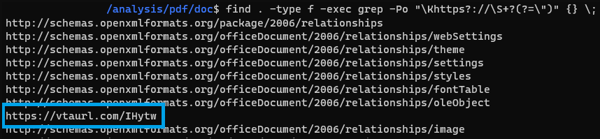 RTF 다운로드는 페이로드가 호스팅되는 하드코딩된 URL인 "vtaurl[.]com/IHytw"과 함께 Word 파일에 내장된 아래 명령의 결과입니다.