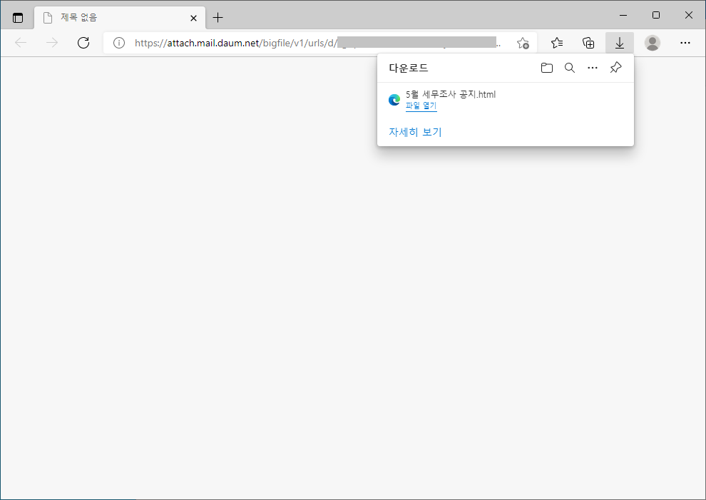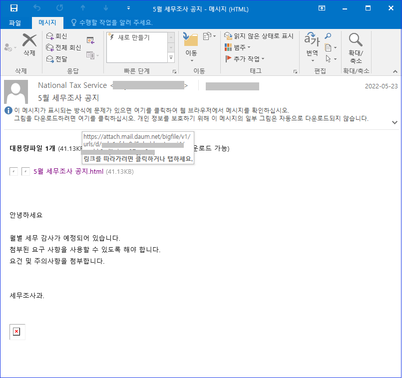 이번에 발견된 피싱 메일은 '5월 세무조사 공지'라는 제목으로 유포되었으며, html 파일이 대용량파일 형태로 파일이 첨부되어 있습니다. 만일 사용자가 해당 메일을 정상 메일로 오인하여 링크를 클릭하면 악성 html 파일이 사용자 PC로 다운로드 됩니다.
