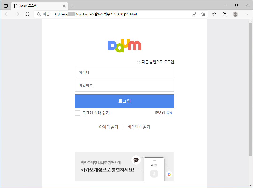 사용자가 다운로드 된 html 파일을 실행하면, 실제 다음(Daum) 로그인 페이지와 유사하게 제작된 피싱 페이지가 나타나며 사용자의 로그인을 유도합니다.