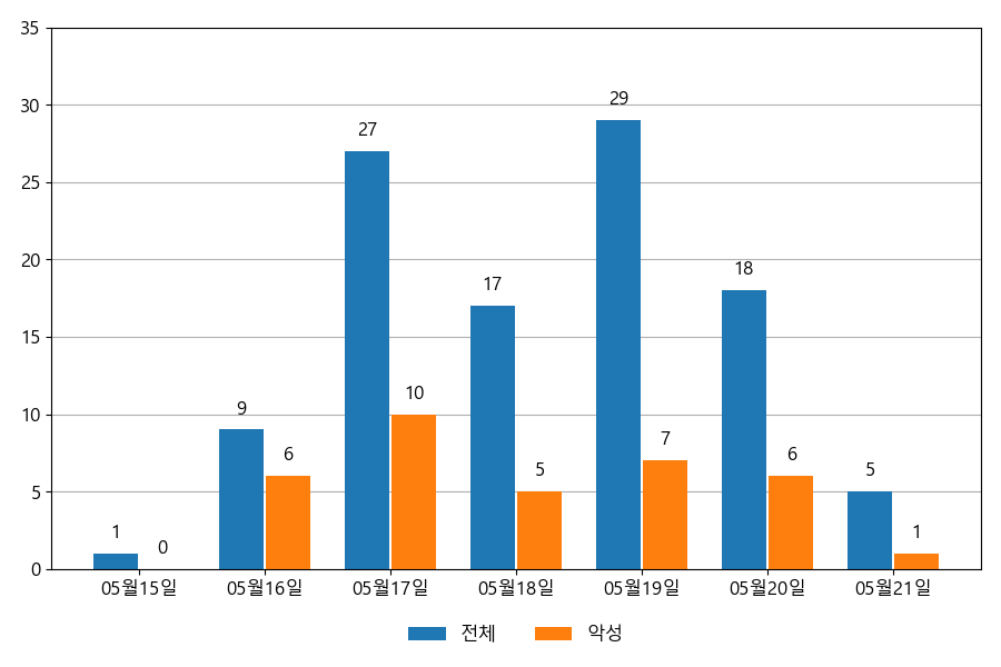 일일 유입량은 하루 최저 1건(악성 1건)에서 최대 29건(악성 10건)으로 일별 편차를 확인할 수 있습니다.