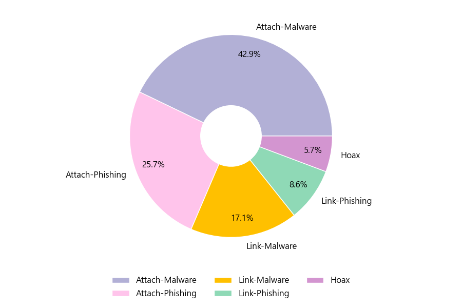악성 이메일을 유형별로 살펴보면 35건 중 Attach-Malware형이 42.9%로 가장 많았고 뒤이어 Attach-Phishing형이 25.7%를 나타냈습니다.
