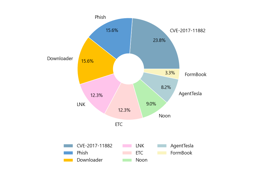 첨부파일은 ‘CVE-2017-11882’형태가 23.8%로 제일 큰 비중을 차지했고 뒤이어 ‘Phish’, ‘Downloader’가 각각 15.6%, 15.6%의 비중을 차지했습니다.