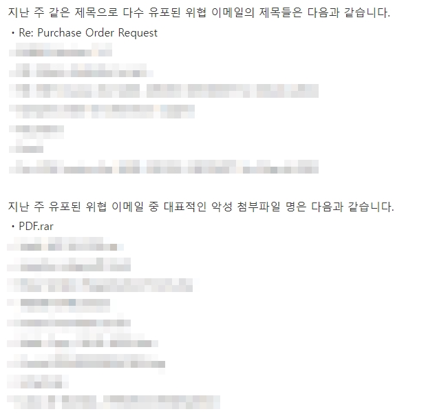 지난주 이메일 유입량은 총 106건이고 그중 악성은 35건으로 33.02%의 비율을 보였습니다. 악성 이메일의 경우 그 전주 38건 대비 35건으로 3건이 감소했습니다.