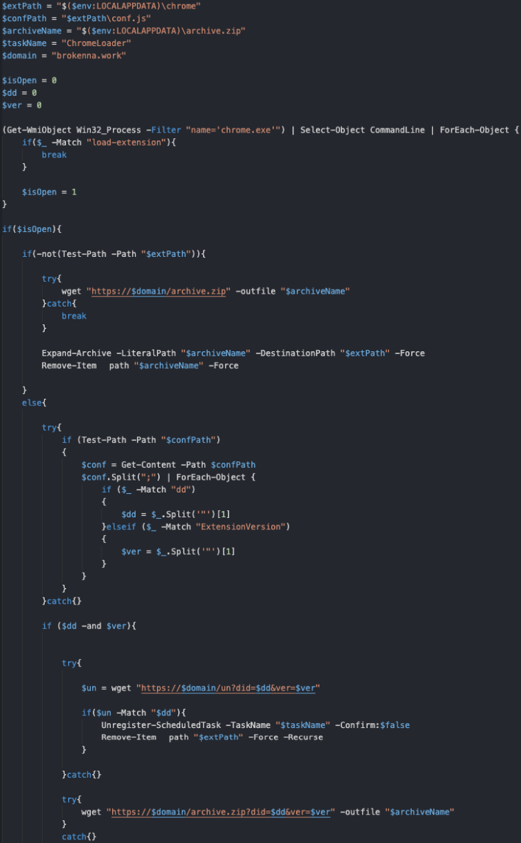 ChromeLoader는 원격 리소스에서 아카이브를 가져와 구글 크롬 확장 프로그램으로 로드하는 PowerShell 명령을 실행 및 디코딩합니다.