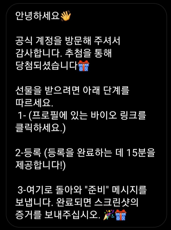 또한 프로필에는 우승자 선정, 당첨이 되신것을 축하드립니다라는 문구를 작성해 놓아 사용자로 하여금 실제로 이벤트에 당첨 안내 계정인것처럼 위장합니다.