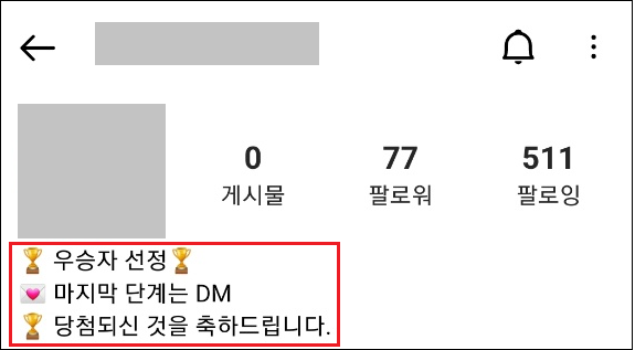 또한 프로필에는 우승자 선정, 당첨이 되신것을 축하드립니다라는 문구를 작성해 놓아 사용자로 하여금 실제로 이벤트에 당첨 안내 계정인것처럼 위장합니다.