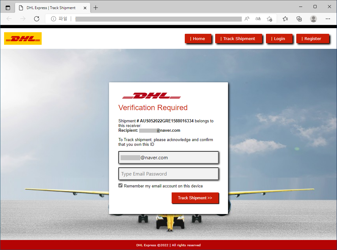 만일, 사용자가 html 파일을 실행한다면 실제 DHL 페이지처럼 위장하고 있는 페이지가 나타납니다.