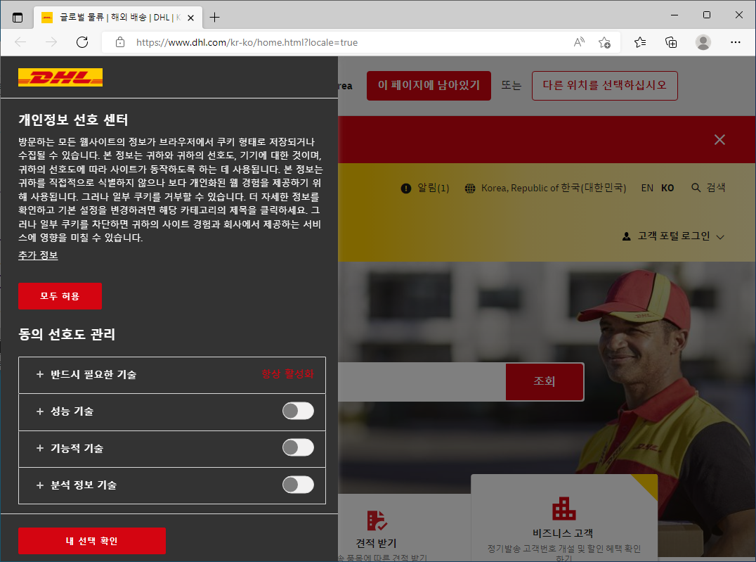 만일, 사용자가 html 파일을 실행한다면 실제 DHL 페이지처럼 위장하고 있는 페이지가 나타납니다.