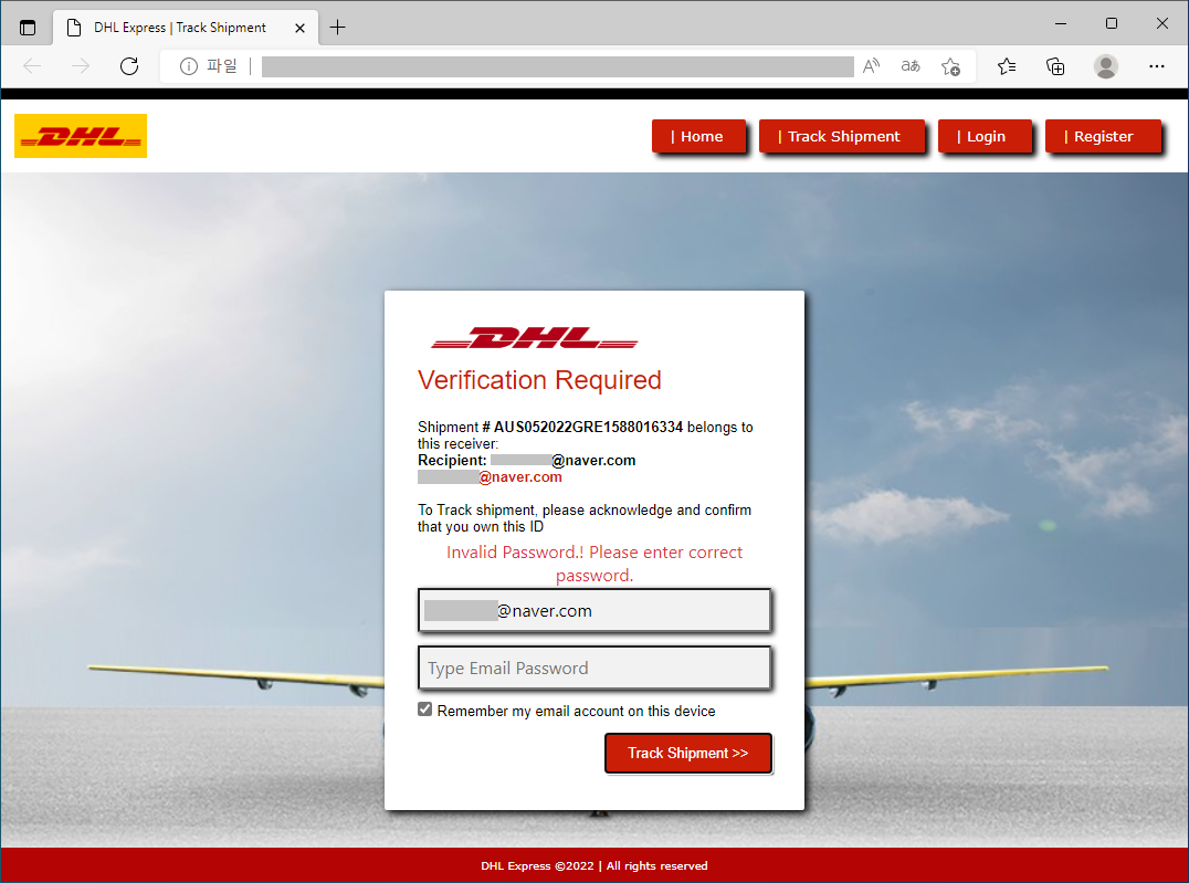사용자가 또 한번 계정정보를 입력하면 역시나 비밀번호가 잘못되었다고 나오며, 잠시 후 공식 DHL 홈페이지로 리디렉션 됩니다.