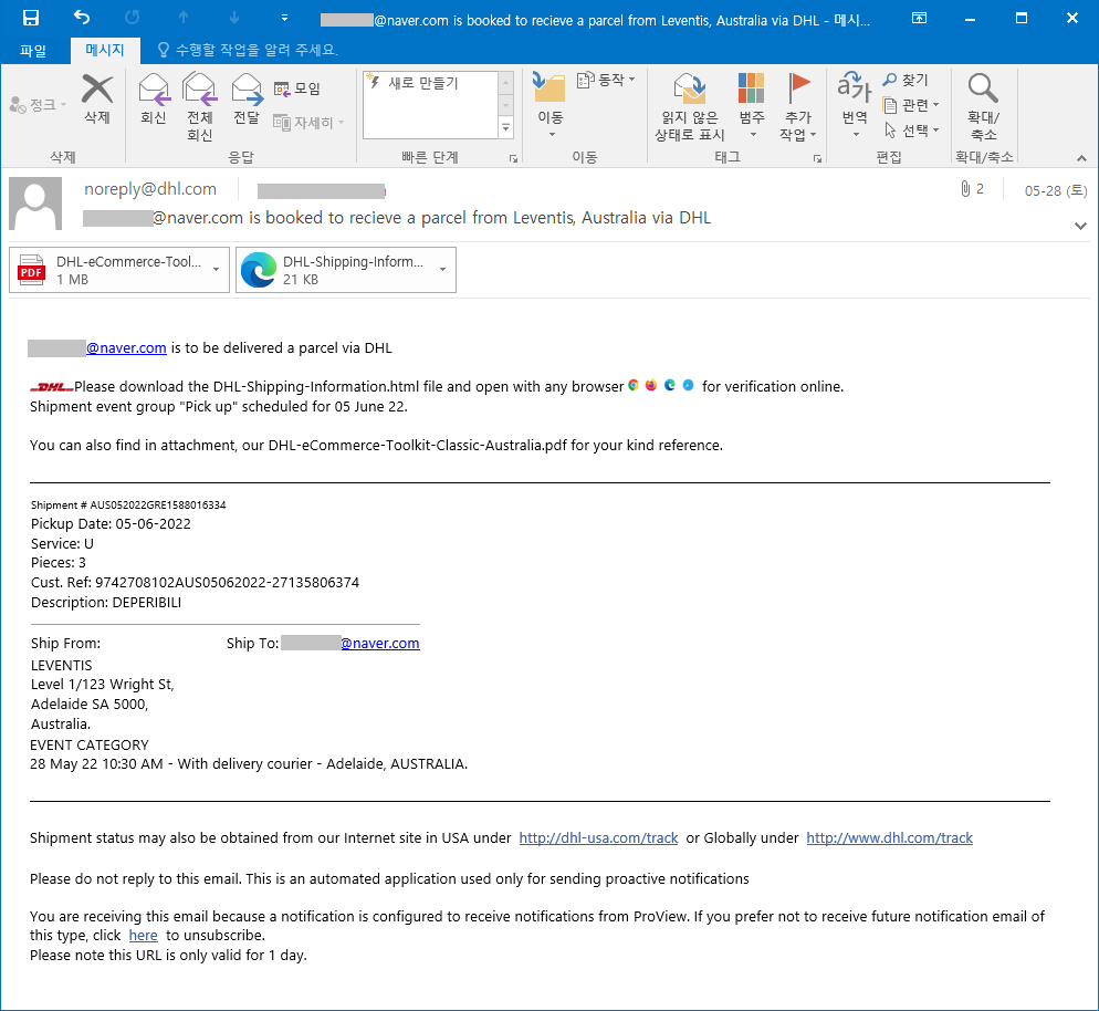피싱 메일은 택배발송과 관련된 송장번호, 발송지 등의 내용이 포함시켜 사용자로 하여금 실제 DHL에서 보낸 것처럼 착각하도록 유도합니다. 피싱 메일에는 pdf 파일과 html 파일이 첨부되어 있으며, 이메일 본문에서 첨부되어 있는 파일들을 열어보라며 사용자의 실행을 유도합니다.