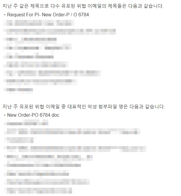 이번주 Pick으로는 서울대 사칭 이메일을 선정했습니다. 본문은 견적 필요하며 첨부된 제안서를 제출하라는 내용이 담겨 있습니다. 첨부파일의 풀어 확인을 하면 악성코드가 설치되며 PC내 많은 정보를 외부로 빼돌리므로 주의가 필요합니다. 자세한 내용은 다음 글을 확인하시기 바랍니다.