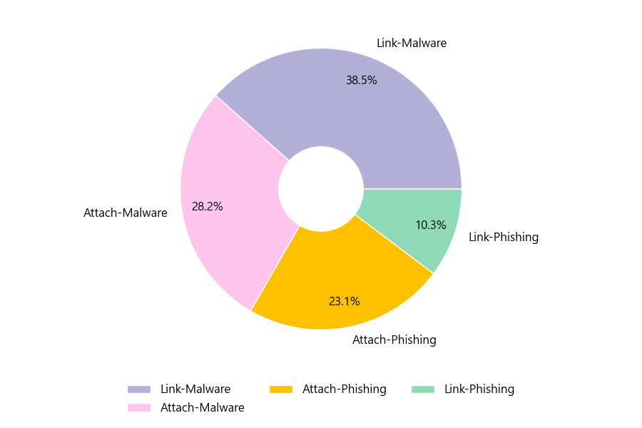 악성 이메일을 유형별로 살펴보면 39건 중 Link-Malware형이 38.5%로 가장 많았고 뒤이어 Attach-Malware형이 28.2%를 나타냈습니다.