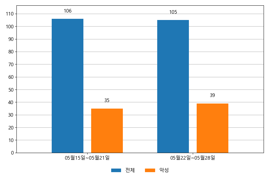 지난주 이메일 유입량은 총 105건이고 그중 악성은 39건으로 37.14%의 비율을 보였습니다. 악성 이메일의 경우 그 전주 35건 대비 39건으로 4건이 증가했습니다.