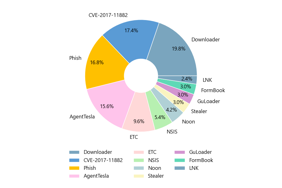 첨부파일은 ‘Downloader’형태가 19.8%로 제일 큰 비중을 차지했고 뒤이어 ‘CVE-2017-11882’, ‘Phish’가 각각 17.4%, 16.8%의 비중을 차지했습니다.