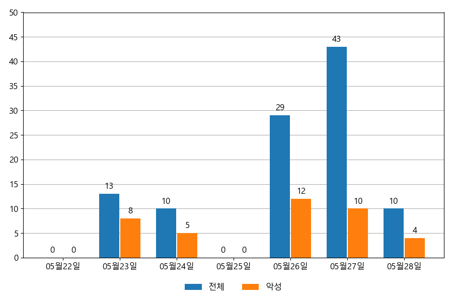 일일 유입량은 하루 최저 10건(악성 4건)에서 최대 43건(악성 12건)으로 일별 편차를 확인할 수 있습니다.