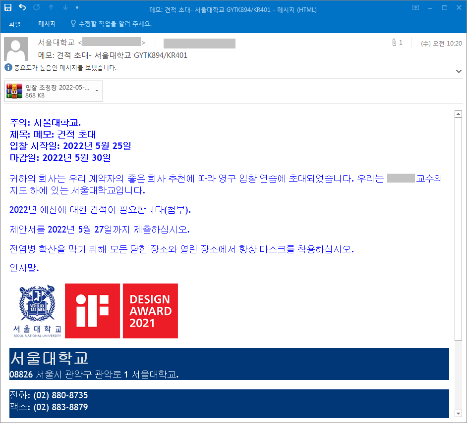 이번주 Pick으로는 서울대 사칭 이메일을 선정했습니다. 본문은 견적 필요하며 첨부된 제안서를 제출하라는 내용이 담겨 있습니다. 첨부파일의 풀어 확인을 하면 악성코드가 설치되며 PC내 많은 정보를 외부로 빼돌리므로 주의가 필요합니다. 자세한 내용은 다음 글을 확인하시기 바랍니다.