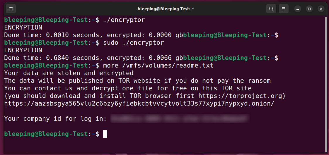 BleepingComputer는 암호화를 위해 다른 경로를 노리는 명령줄 인수를 찾을 수 없었습니다. 이로써 해당 랜섬웨어가 ESXi 서버만을 노리도록 특별히 설계되었음을 알 수 있습니다.