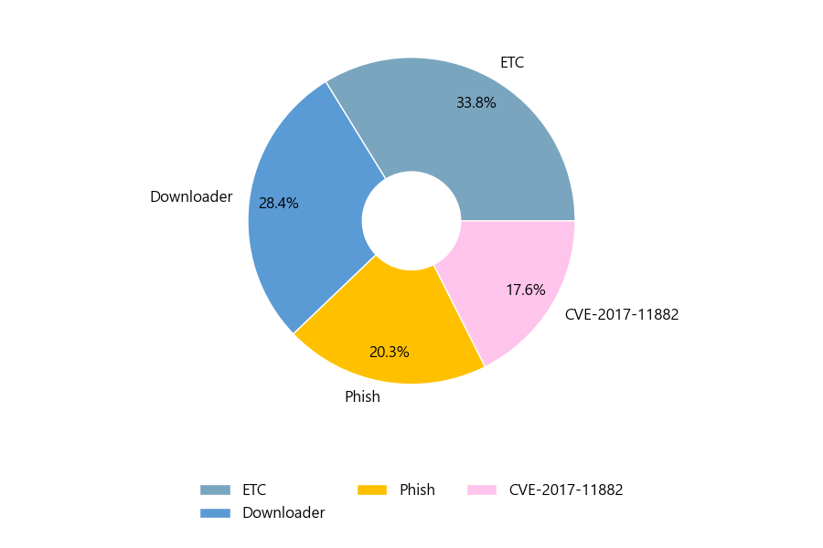 첨부파일은 ‘ETC’형태가 33.8%로 제일 큰 비중을 차지했고 뒤이어 ‘Downloader’, ‘Phish’가 각각 28.4%, 20.3%의 비중을 차지했습니다.