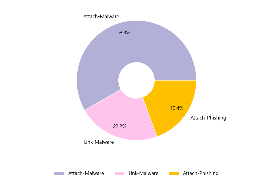 악성 이메일을 유형별로 살펴보면 36건 중 Attach-Malware형이 58.3%로 가장 많았고 뒤이어 Link-Malware형이 22.2%를 나타냈습니다.