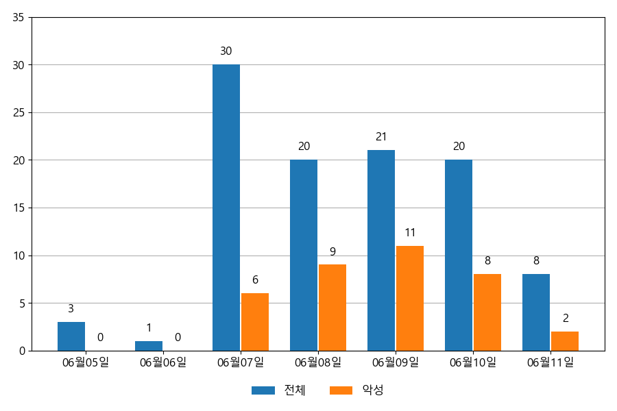 일일 유입량은 하루 최저 1건(악성 2건)에서 최대 30건(악성 11건)으로 일별 편차를 확인할 수 있습니다.