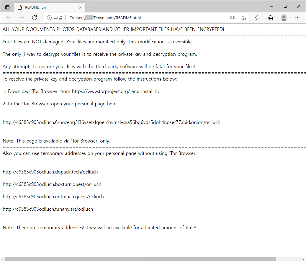매그니베르 랜섬웨어는 사용자 PC에서 실행 후 '기존파일명.ocliuch'로 변경하며, 파일들이 암호화된 폴더마다 README.html 파일명의 랜섬노트를 생성합니다.