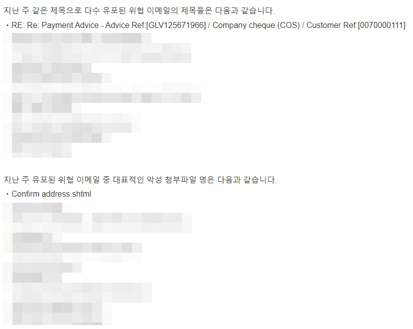 지난주 이메일 유입량은 총 109건이고 그중 악성은 31건으로 28.44%의 비율을 보였습니다. 악성 이메일의 경우 그 전주 21건 대비 31건으로 10건이 증가했습니다.
